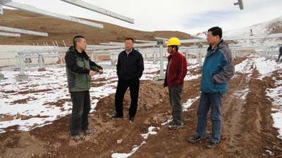 王總經(jīng)理抵達(dá)玉樹后,首先前往金太陽2兆瓦水光互補(bǔ)發(fā)電項(xiàng)目工地,對工程形象進(jìn)度、設(shè)備到貨及安裝就位、職工生活情況,特別是目前工程建設(shè)所面臨的困難等做了全面深入的了解。王總經(jīng)理要求青海玉能電力開發(fā)有限公司克服氣候寒冷等不利因素,合理調(diào)配資源,增加安裝施工人員,保證各類材料設(shè)備及時(shí)到貨,加快項(xiàng)目建設(shè)進(jìn)度,確保實(shí)現(xiàn)年底投產(chǎn)發(fā)電目標(biāo)。隨后,王總經(jīng)理一行又來到禪古水電站大壩檢查,詳細(xì)詢問了庫區(qū)來水情況,要求玉樹電力公司高度重視水庫運(yùn)行和安全保障工作。